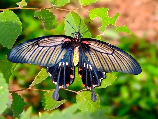 ところで、ナガサキアゲハは、とても大きなアゲハチョウの仲間ですが、オスとメスの翅の模様がかなり違い、メスの方が目立ちます。また、尾状突起がないという、アゲハにしてはちょっと特殊な形をしています。