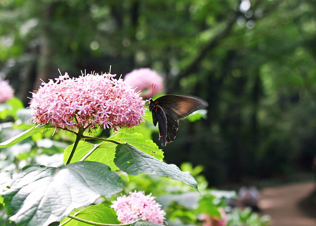 有尾型は、ツマグロヒョウモンと同様に、ベイツ型擬態によるもので、モデルは南国のチョウ、オオベニモンアゲハと言われています。これに対して今関東地方に生息している尾状突起のないナガサキアゲハは非擬態型というそうです。