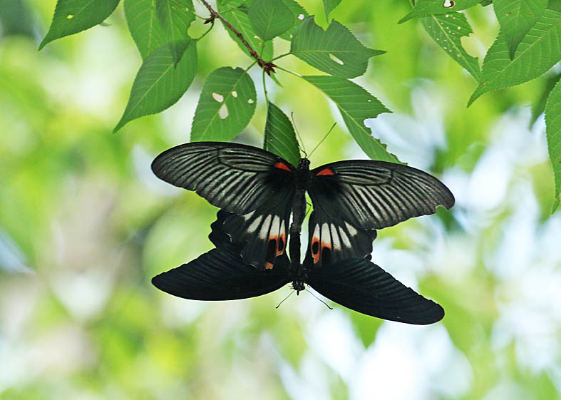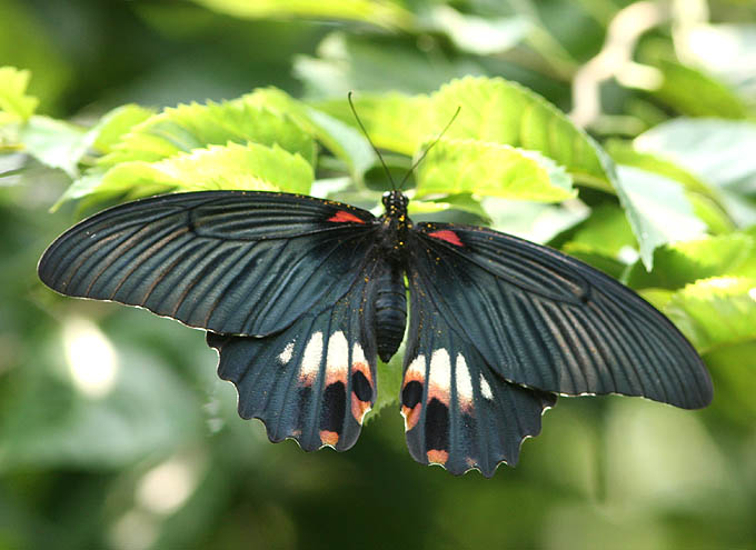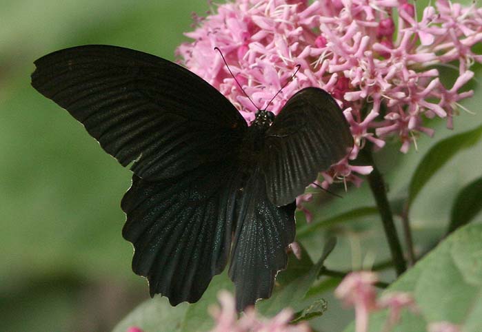 ▲ナガサキアゲハのオス 表から見るとほとんど真っ黒、下翅の裏にかすかに斑紋がある。