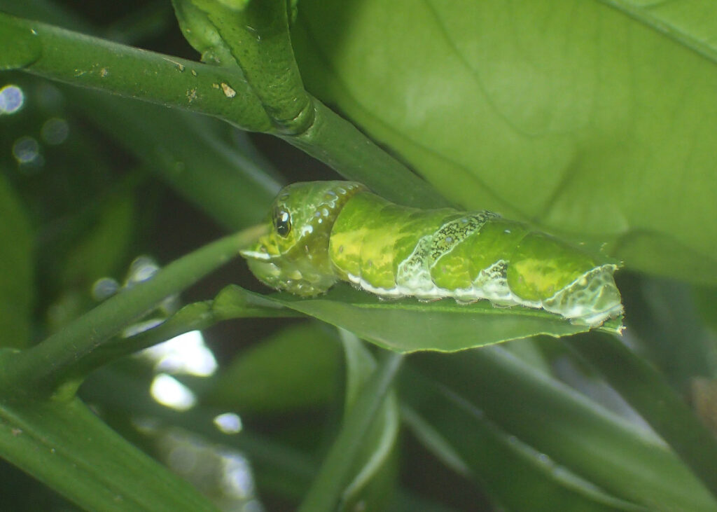 ▲園内で交尾するナガサキアゲハのペアと園内のミカンの樹で育つ幼虫