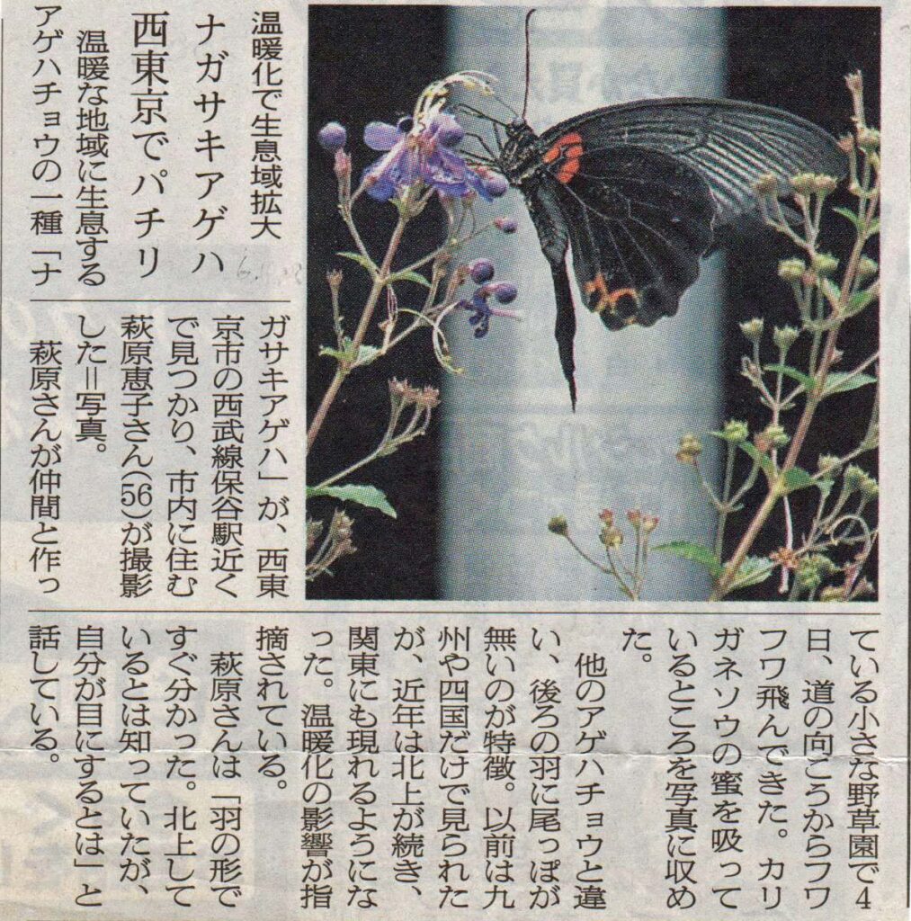 東京でナガサキアゲハが見らるということは当時はニュースにもなる出来事だったので、新聞記事になったりもしました。