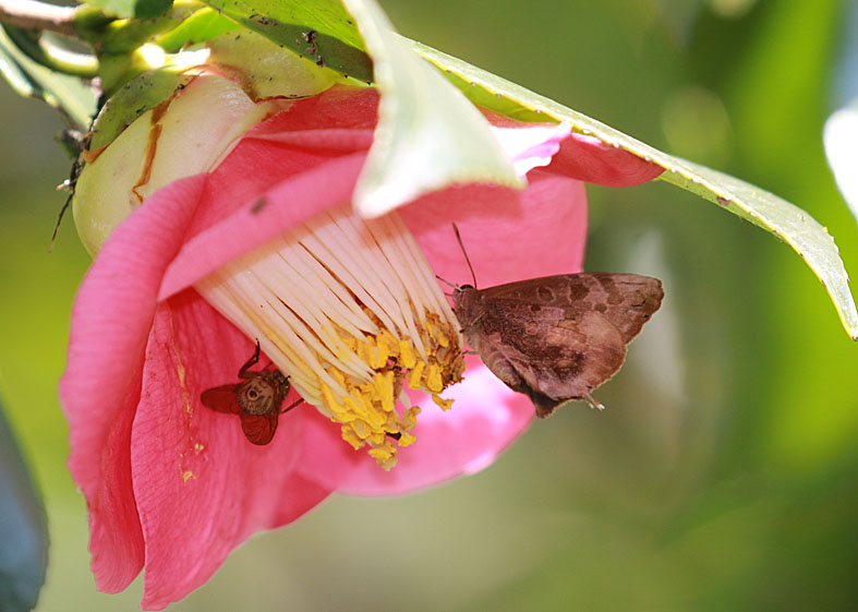 ▲越冬場所近くの花(ビワ・ツバキ)で吸蜜するムラサキツバメ