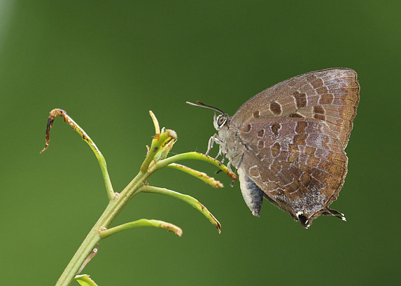 ムラサキツバメはシジミチョウ科のチョウです。このチョウも、チョウ愛好家以外には、あまり知られていないチョウです。小さいし、翅を閉じていると目立たない茶色だし、花から花へひらひらと飛ぶチョウではないからでしょう。このチョウは、食草のマテバシイでメスを待つか、冬季に越冬場所で探さないとなかなか目にできません。
