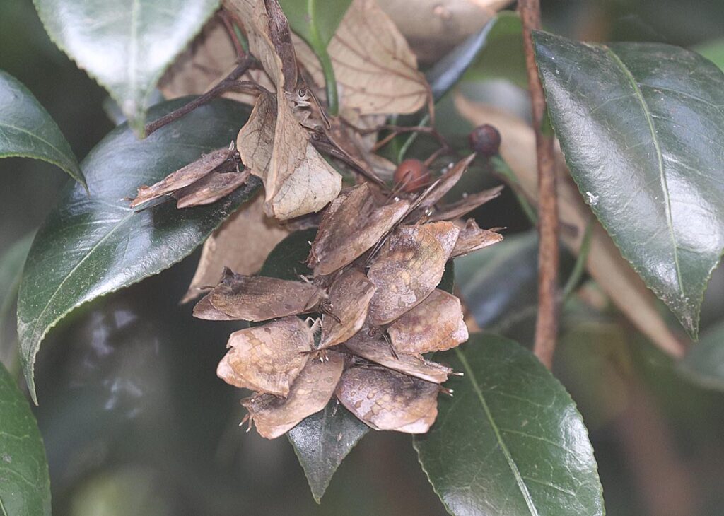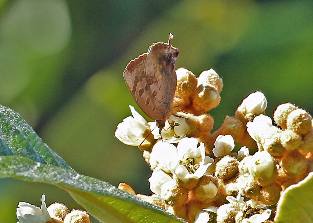 クロコノマチョウはツマグロヒョウモンやナガサキアゲハと比べると、地味なチョウ(タテハチョウ科)です。花にも来ないし、落ち葉の上などに止まっていると、見事なカモフラージュとなって、目に入りません。成虫で越冬するので、冬に落ち葉の上を歩いていると、いきなり飛び出したりして気づくことが多いです。