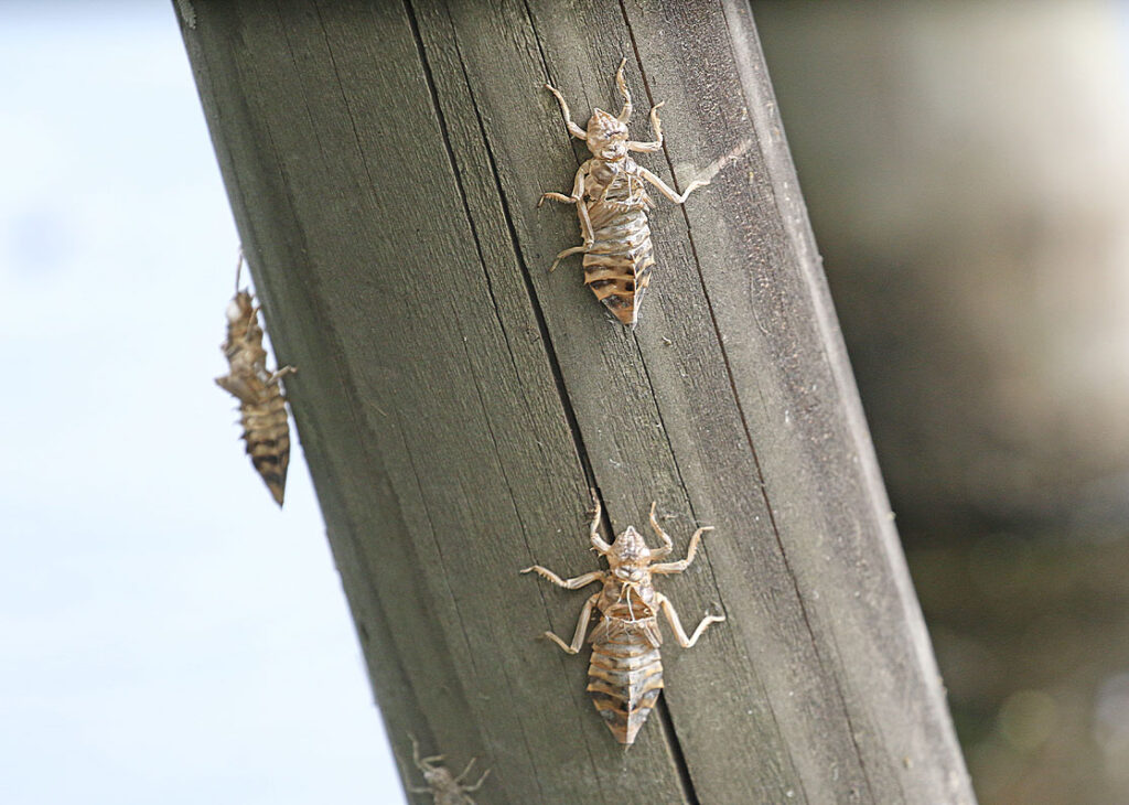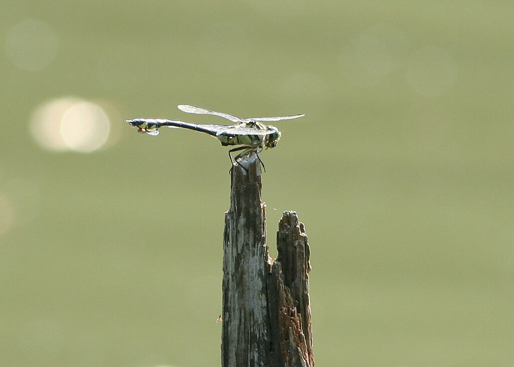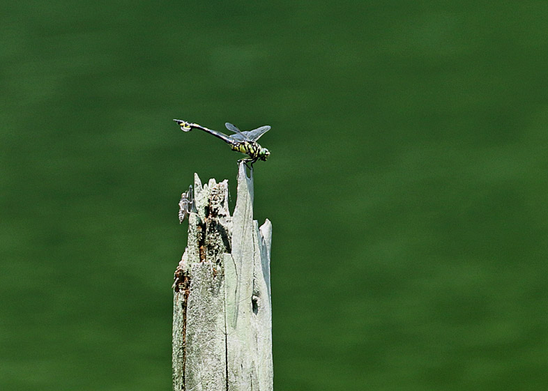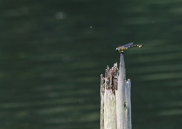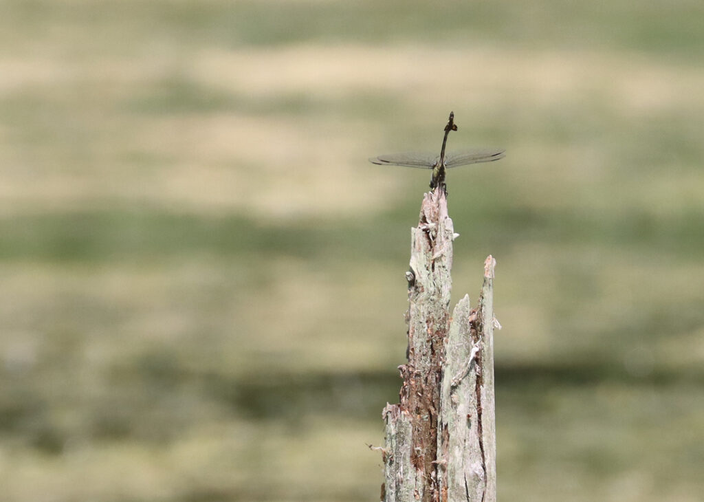 成熟したウチワヤンマのオスは、水面から突き出した杭や枝先に止まって、メスを待ち、他の大型トンボが飛んでくると追い払うという行動をとります。 いかにもウチワヤンマが好みそうな杭があって、毎年、代が代わっても同じ杭の上にとまっていることが多いのも面白いです。