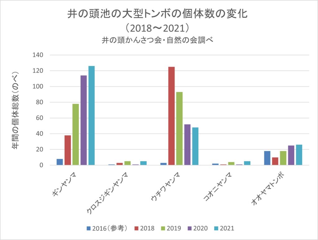 このようにかいぼりの結果爆発的に増えたウチワヤンマでしたが、その後どうなったかというと、なぜかだんだんに減ってきています。(グラフ参照)